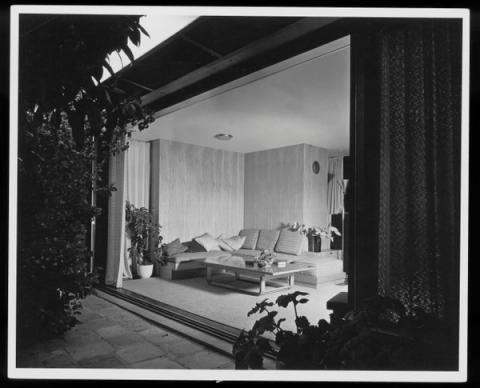 In 1939 a major addition was built in the garden facing the rear street edge of the property. Labeling the space a “garage” with minimal set-back to pass plan check and to secure a building permit, it became “the Play Room” to accommodate the three active Neutra boys, keeping them apart from the serious architectural practice in the main house. The link from this new addition to the original house was at ground level and separated the garden into north and south patios. Neutra called it VDL-A, or the Garden House. The wooden posts and steel casement windows are painted in Aluminum paint. The Eugenia hedge on the north-end of the building, facing Edgewater, gives privacy to the bedroom, which has floor-to-ceiling sliding glass doors from end to end.