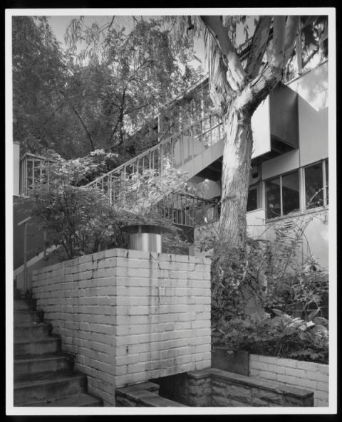 The limited treeless site inspired Neutra to strive to demonstrate his ability to achieve privacy and spacious living despite the constraints and density of the neighborhood. Unlike adjacent one-story low houses, he built vertically to take advantage of the views over the reservoir, the San Gabriel Mountains to the far north, and his own peaceful garden to the rear. For privacy the first floor of the north wall was likewise unbroken. Neutra planted fast-growing trees and other plants to the very edge of the sidewalk, providing solar protection and privacy from Silver Lake Boulevard. Taking advantage of vague enforcement of setback requirements, he built to the street line and to the full 60-foot width north and south as well.