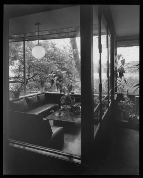 Unlike the experimental metal skeleton of the Health House, Neutra used less costly wood balloon-framing dimensioned to accommodate standard industrial steel window sash, but the modular rhythms and crisp detailing of design gave it some of the same visual qualities. The wood-frame design was also believed to provide elasticity in earthquakes. Prefabricated concrete joists and a suspended slab provided a fire-retardant base for the first floor. Continuous metal casements throughout determined a precise modular system of milled 4 x 4 wood columns. On the front elevation stucco bands emphasized the horizontal lines to the maximum. Panels on the rear elevation were of painted pressed wood. The original house utilized two gravity furnaces with push-button controls. Shading of the second-story windows to the west was provided by a five-foot overhang with an aluminum-faced drop awning at its eave. Below, first-story windows were shielded by a heavy planting of pittosporum and acacias.