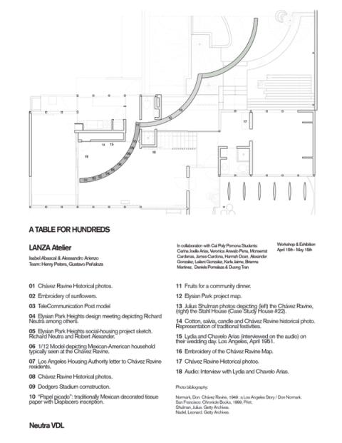 The workshop and Installation at the VDL, the house that Richard Neutra and his son Dion built for their family, wants to contribute to preserve the memory of Palo Verde, La Loma and Bishop. The installation will consist of a very long table that focuses on collectivity, the act of gathering and sharing. This table navigates through the house’s interior and garden. With its super-dimensioned length, the table is also a homage to Chavez Ravine 1000 families as if it was designed to accommodate 1000 people at the same time.
