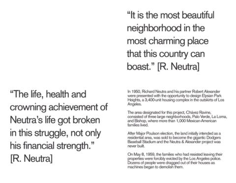 In 1950, Richard Neutra and his partner Robert Alexander were presented with the opportunity to design Elysian Park Heights, a 3,400-unit residential complex on the outskirts of Los Angeles. The area designated for this project, Chávez Ravine, consisted of three large neighborhoods, Palo Verde, La Loma, and Bishop, where more than 1,000 Mexican-American families lived. Neutra immediately left to tour the area and interview the neighbors. After visiting many of the existing houses, some with small orchards or neighboring farms, he declared “it is the most beautiful neighborhood in the most charming place that this country can boast.”